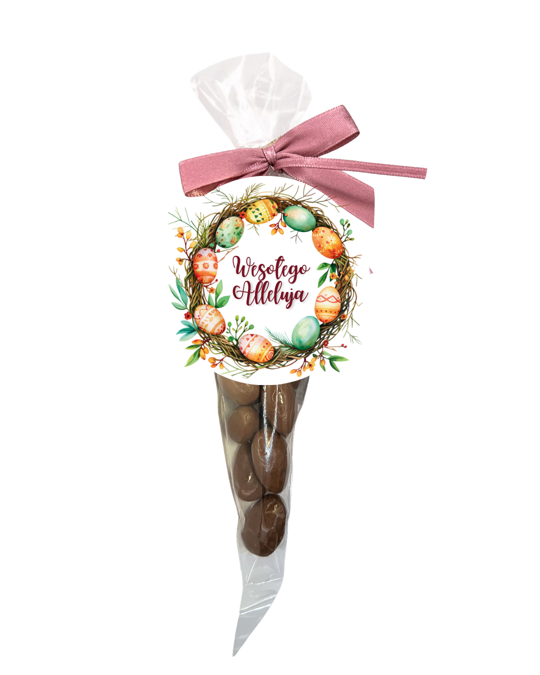 Migdały w czekoladzie mlecznej w ozdobnym rożku z kokardką i bilecikiem „Wesołego Alleluja” stanowią prosty pomysł na drobny upominek wielkanocny. Chrupiące migdały pokrywa warstwa mlecznej czekolady o łagodnym smaku, dzięki czemu całość tworzy klasyczną, chętnie wybieraną słodką przekąskę. Forma rożka podkreśla świąteczny charakter i pozwala wręczyć produkt bez dodatkowego pakowania.